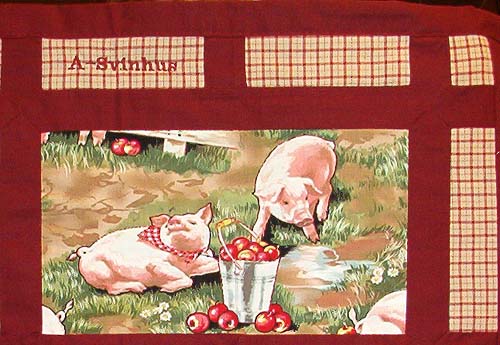 Bodil fra Vitus Bering Quilterne har syet dette helt eventyrligt søde tæppe med masser af grise! Stof fra Patchworkshoppen i Horsens.. Mål: 60 x 70 cm. Håndsyet. Man får virkelig lyst til at sy sådan et! Juni 2006.